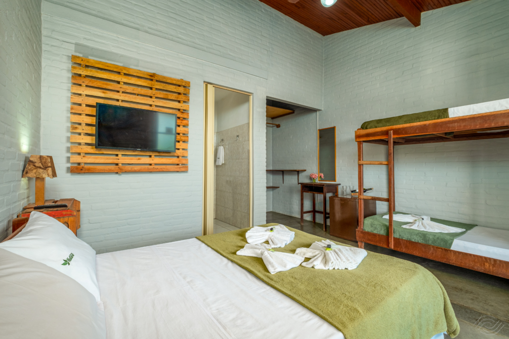 Apartamento com cama de casal e beliche, acomoda até 4 pessoas.