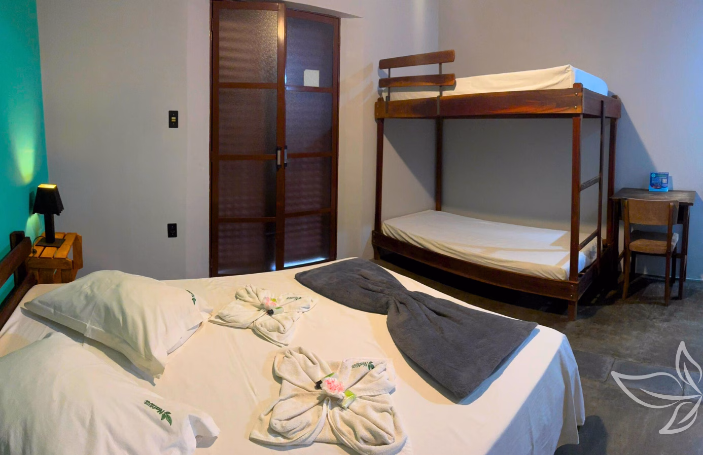 Apartamentos com cama de casal e beliche, acomodam até 8 pessoas.
